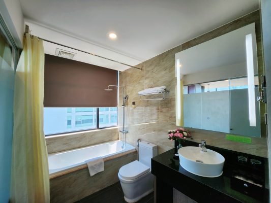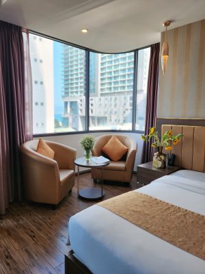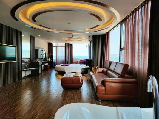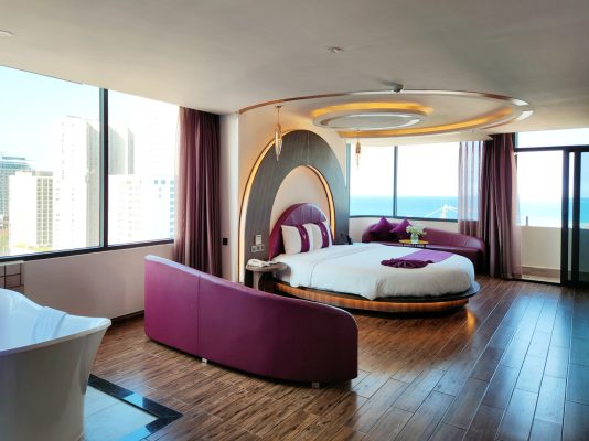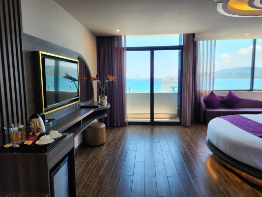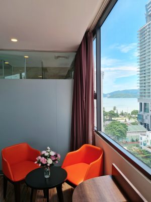 Chỗ nghỉ ngơi thoải mái: Khách sạn V Hotel Nha Trang tại Nha Trang cung cấp các phòng gia đình với máy lạnh, phòng tắm riêng và tầm nhìn ra thành phố hoặc biển. Mỗi phòng đều có minibar, TV và WiFi miễn phí. Tiện nghi đặc biệt: Du khách có thể tận hưởng hồ bơi trên tầng thượng, trung tâm thể dục, sân hiên tắm nắng và lò sưởi ngoài trời. Các tiện nghi bổ sung bao gồm phòng chờ, quán cà phê và khu vực dã ngoại. Trải nghiệm ẩm thực: Nhà hàng thân thiện với gia đình phục vụ các món ăn Việt Nam, địa phương và quốc tế với các lựa chọn ăn chay. Bữa sáng bao gồm các món ăn lục địa, Mỹ, tiệc tự chọn và châu Á. Vị trí đắc địa: Cách Sân bay Quốc tế Cam Ranh 35 km, khách sạn chỉ cách Bãi biển Nha Trang và các điểm tham quan gần đó như Trung tâm Thương mại Nha Trang Center một quãng đi bộ ngắn. Có dịch vụ lặn biển tại khu vực xung quanh.