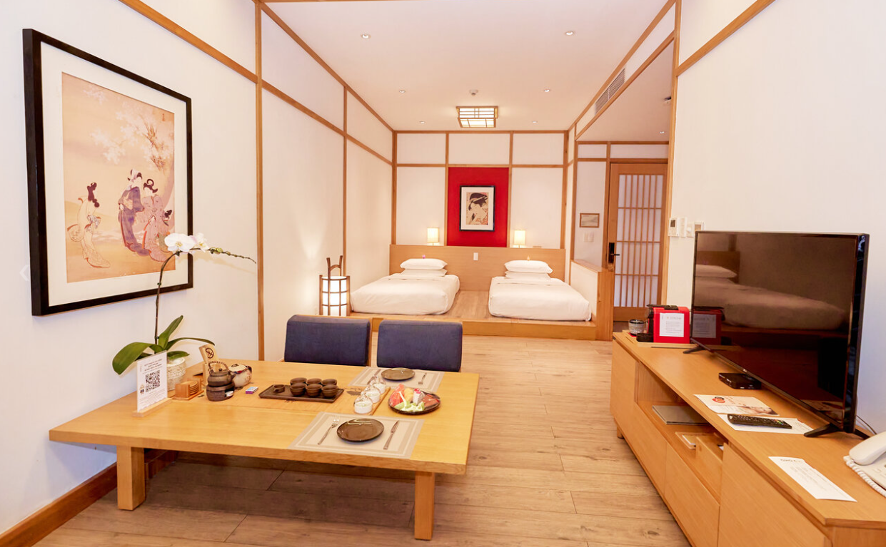 Washitsu Omotenashi là hạng phòng có diện tích lớn nhất 75m2, được thiết kế mở ra không gian hoàng tộc Nhật Bản hướng ra khu vườn Nhật. Ngoài 01 bể tắm khoáng nóng và 01 phòng xông hơi riêng biệt, trong các căn Omoteashi còn có không gian giếng trời thoáng mát và bể tắm sứ mang đến cho du khách những khoảnh khắc thư giãn, tái tạo năng lượng từ tận sâu bên trong.